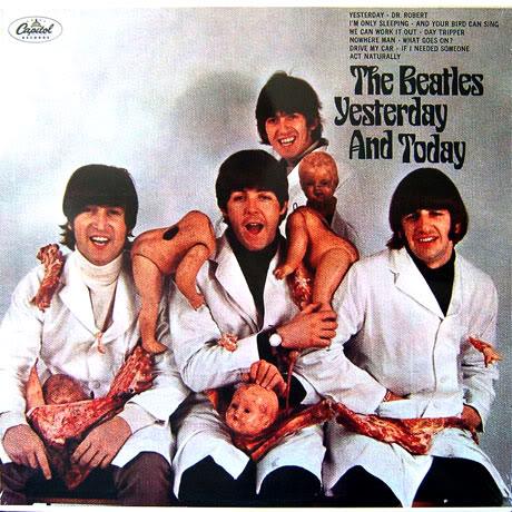 The Beatles “Yesterday and Today” Los Beatles —o parte de ellos— sí se sintieron más cómodos al utilizar una de sus fotografías más chocantes para ilustrar el recopilatorio Yesterday and today. En la imagen aparecían disfrazados de médicos, manchados de sangre, rodeados de muñecos despedazados que simulaban ser niños muertos. El truculento montaje, que había sido idea del fotógrafo de una de sus sesiones, divirtió a los cuatro músicos. Aceptaron posar de tal manera porque estaban hartos de las típicas fotos promocionales “happy” e inocentes que el público asociaba con ellos. Pero fueron tantas las tiendas que se negaron a poner aquella portada en sus exhibidores y tan fuertes las críticas, que la discográfica se vio obligada modificar la portada. Pegaron —literalmente— una nueva fotografía sobre la funda de los discos que aún tenían por vender. Paul McCartney, el principal impulsor de la idea de la carátula, se mostró decepcionado e hizo comentarios despectivos hacia quienes se habían escandalizado por la imagen, afirmando que aquello era una metáfora sobre la guerra del Vietnam. Lennon estuvo de acuerdo con la ocurrencia de usar la foto en la portada, como era de esperar habiendo fetos, sangre y cosas desagradables de por medio. A quien parece que no le hizo mucha gracia fue al etéreo George Harrison, que lo consideró una idea “estúpida”. Hoy en día el disco con la portada original es una pieza de coleccionista de mucho valor monetario.