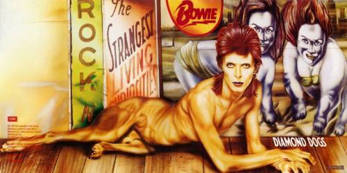 David Bowie “Diamond Dogs” Proyectando ambigüedad sexual y dando material a la prensa con floridas declaraciones, consiguió que se hablase mucho más de él de lo que ya se habría hablado con los grandiosos discos que había estado grabando. Y fue en este disco donde Bowie eligió una cubierta de dudoso gusto que levantó bastante polémica. Se trataba de un dibujo que lo presentaba convertido en una especie de híbrida mutación queer de un perro, conveniente provisto de sus perrunos genitales. Una vez más, la discográfica se vio obligada a retocar la portada, eliminando con aerógrafo las partes pudendas de Bowie para convertirlo en un híbrido igualmente horrendo, pero eso sí, asexuado. Hoy en día, un ejemplar del disco en el que aparezcan esos genitales constituye una valiosa rareza por la que se paga bastante dinero.
