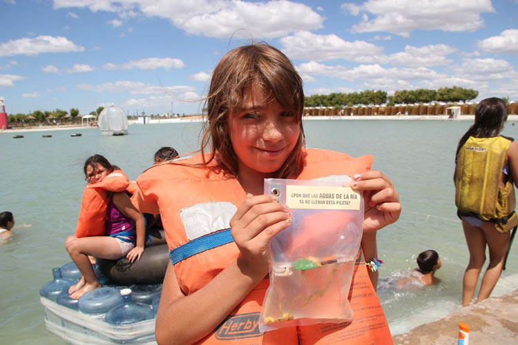 Convertimos nuestra balsa de bidones en una sala flotante. En lugar de vitrinas pusimos una palangana y, adentro, bolsitas con el único pero complejo objeto de esta muestra para visitantes descalzos: las aguas de la ría.