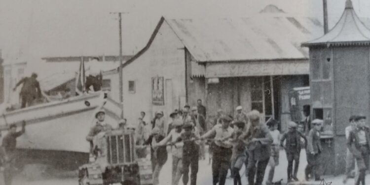 En el Archivo Fotográfico del Museo encontramos esta imagen de 1934, cuando la lancha de pesca artesanal La Nueva Lucía salió de los talleres de Renato Serri por calle Cárrega, para esperar la próxima marea y empezar a pescar. En la foto se ve cómo el tractorcito que debía empujar el carro con la lancha al parecer no tenía suficiente fuerza, por lo que vecinos y vecinas ayudaban tirando todos juntos de una guía.